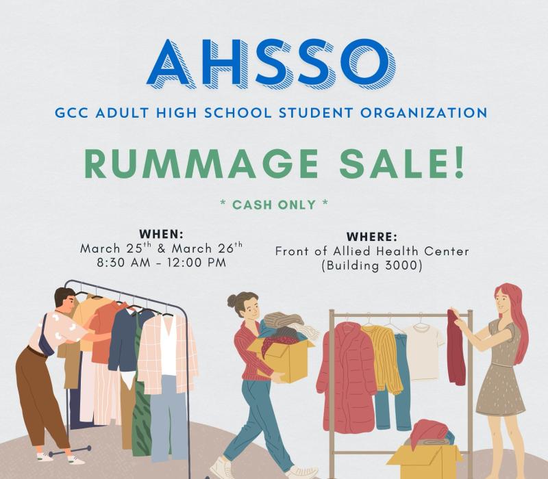 Come support and score some amazing deals! AHSSO (GCC Adult High School Student Organization) is hosting a Rummage Sale this week! Swing by and grab a bargain. CASH ONLY