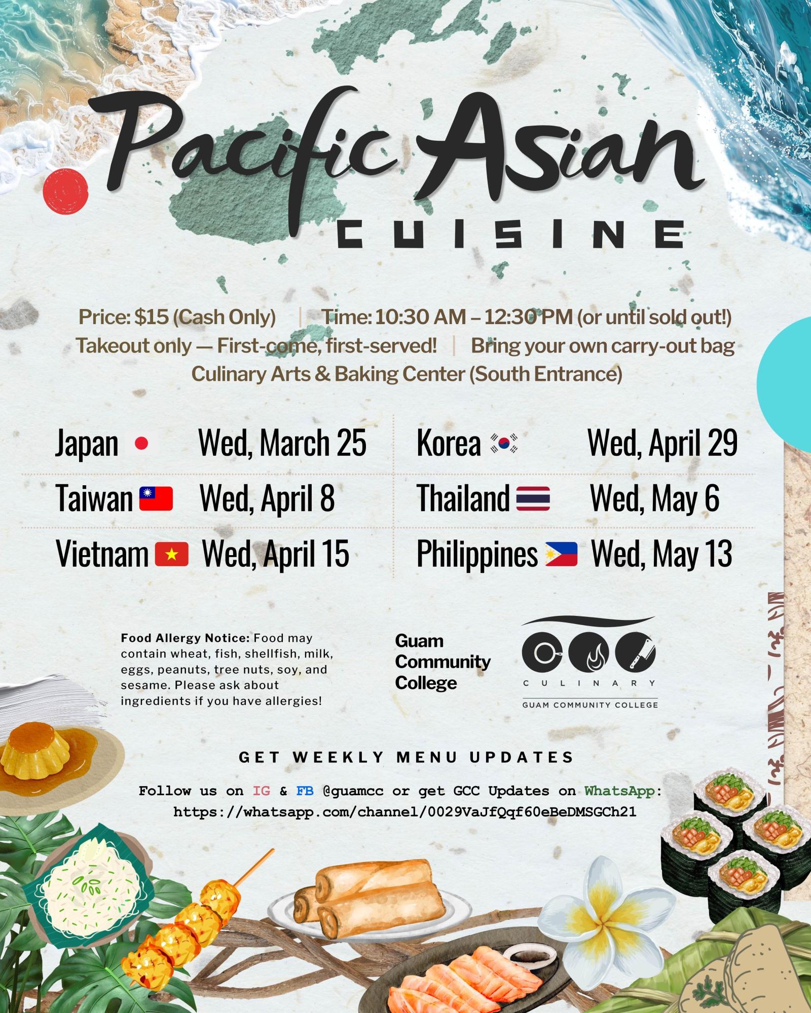 Mark your calendars! Pacific Asian Themed Takeouts are BACK! Join Guam Community College's Pacific Asian Cuisine class for delicious theme buffets inspired by flavors across the Pacific and Asia, running March through May! Come hungry and support our amazing culinary students!