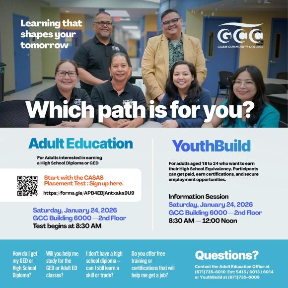 Questions? Contact the Adult Education Office at (671)735–6010  Ext: 5415 / 6013 / 6014 or YouthBuild at (671)735–6009