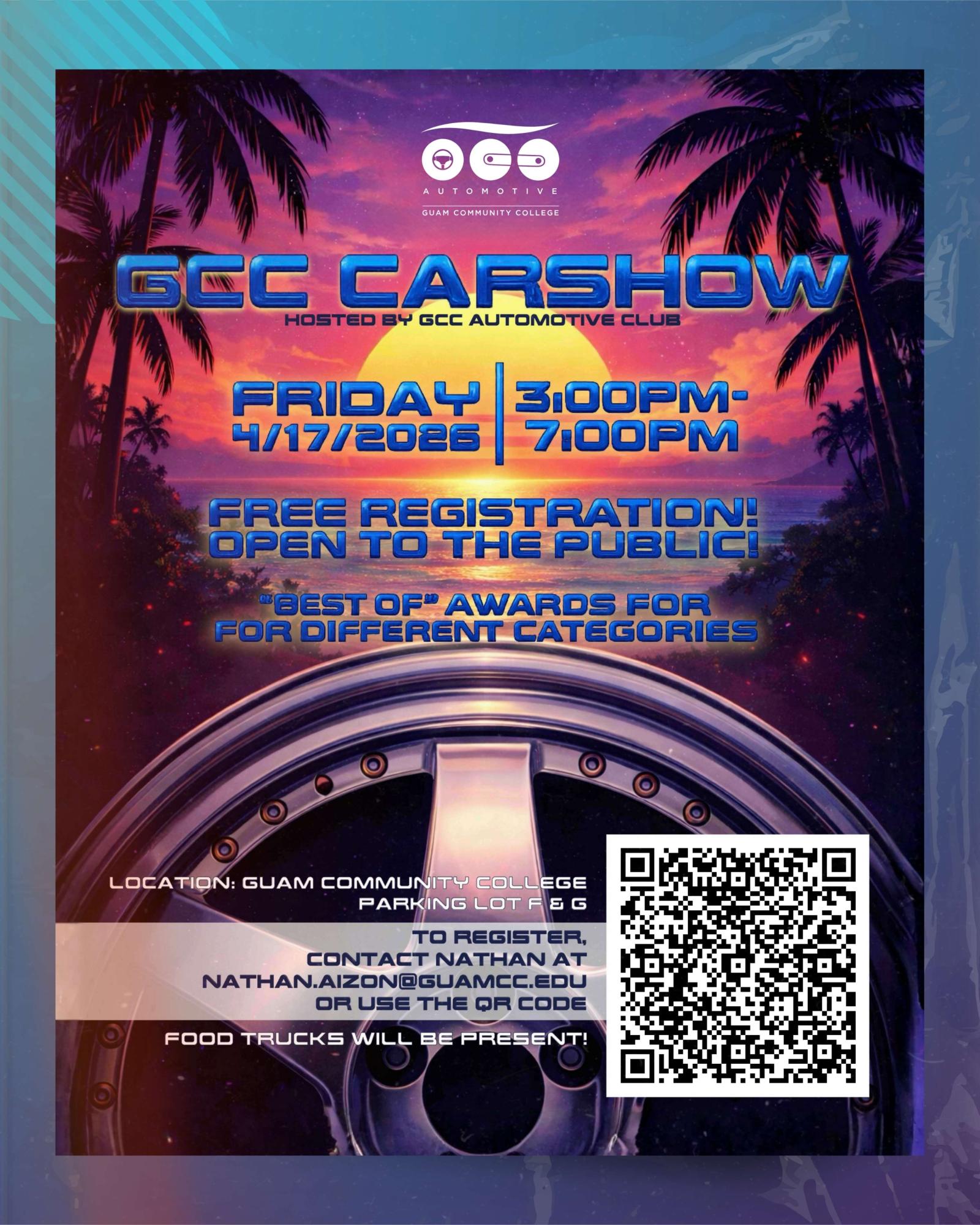 GCC’s Automotive Club is hosting its annual Car Show on Friday, April 17, 2026, from 3:00 – 7:00 PM.