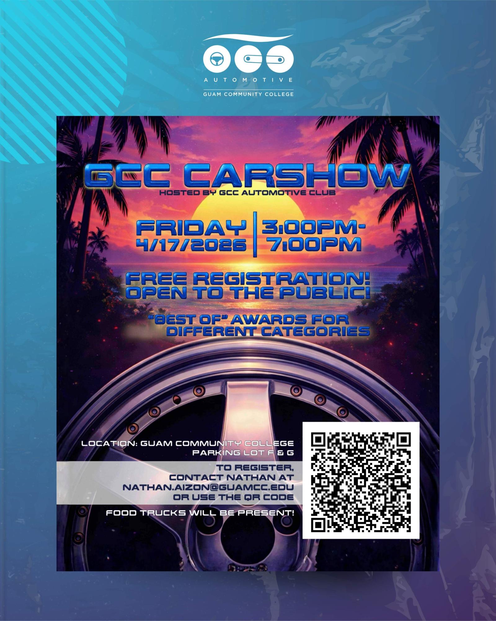 GCC’s Automotive Club is hosting its annual Car Show on Friday, April 17, 2026, from 3:00 – 7:00 PM.