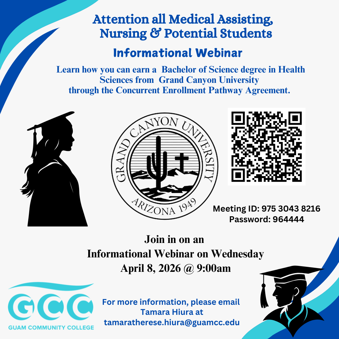 The Nursing & Allied Health Department is available to assist you! So visit us at the Anthony A. Leon Guerrero Allied Health Center, second floor, room 3213, (671)7350–113 Ex. 0504