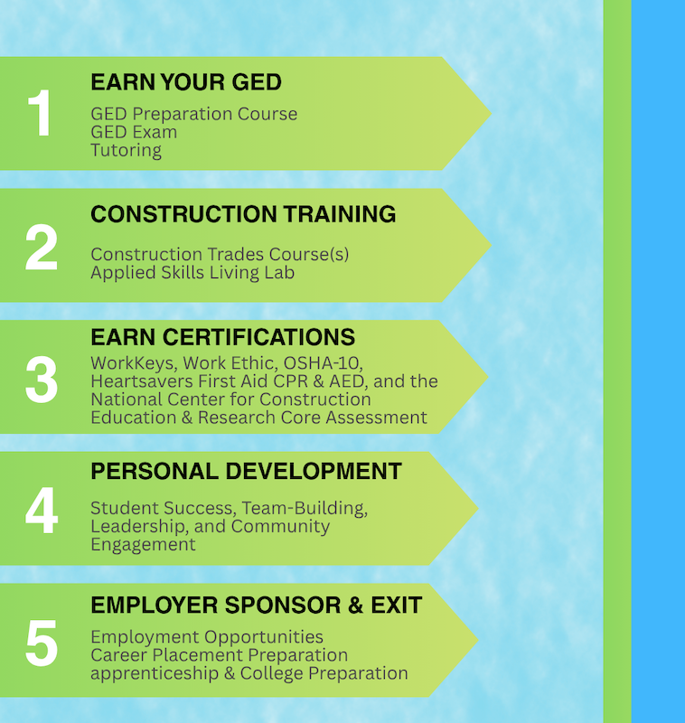The mission of the program is to provide “opportunity youth” training services through transformation and support. Students are supported through education, construction training, motivation, and work skills necessary to succeed in life.