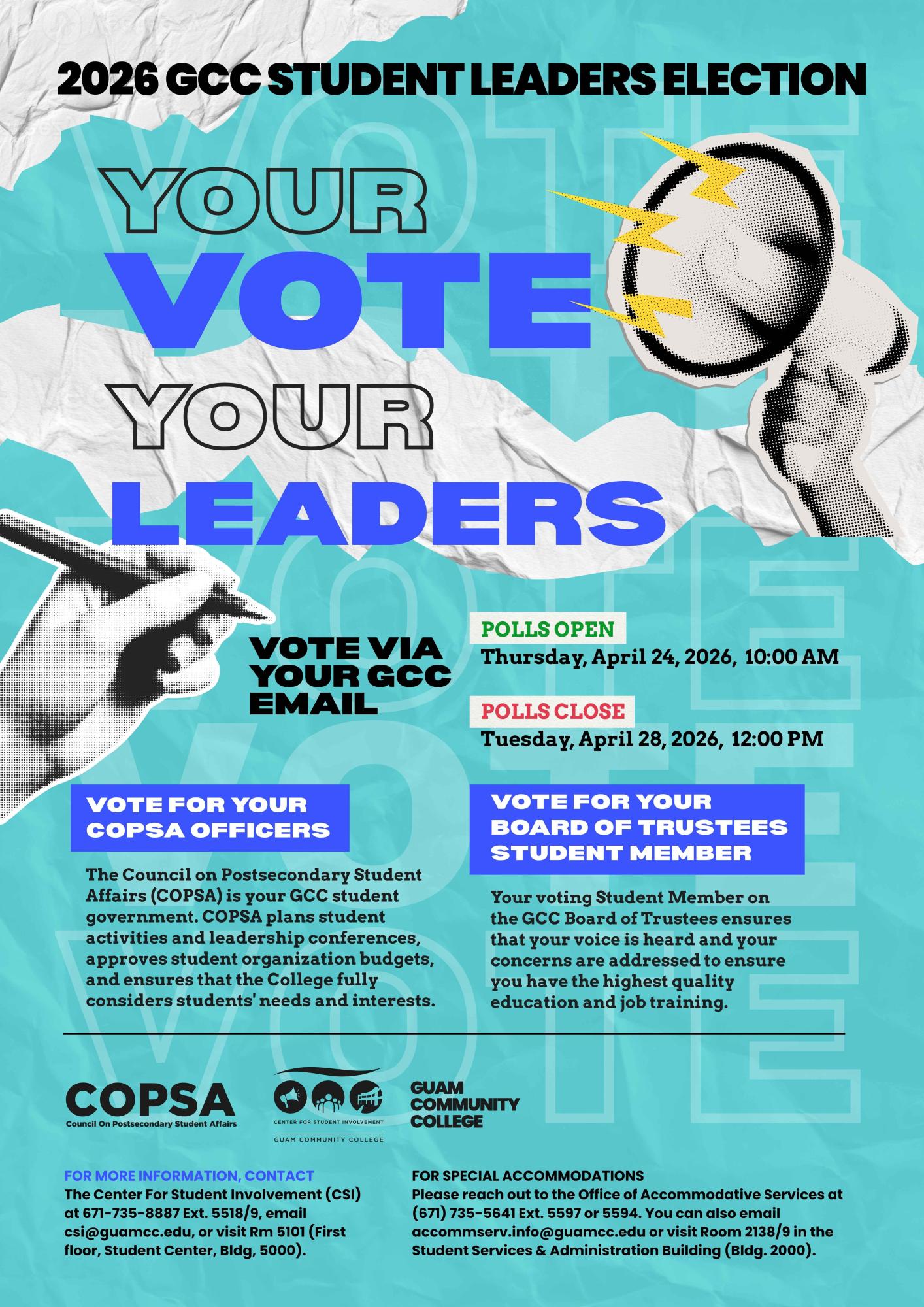 GCC students, your voice shapes our college! Vote via your GCC email for the 2026 Student Leaders Election: