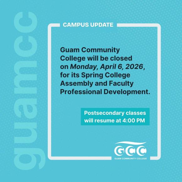 Guam Community College will be closed on Monday, April 6, 2026, for its Spring College Assembly and Faculty Professional Development.